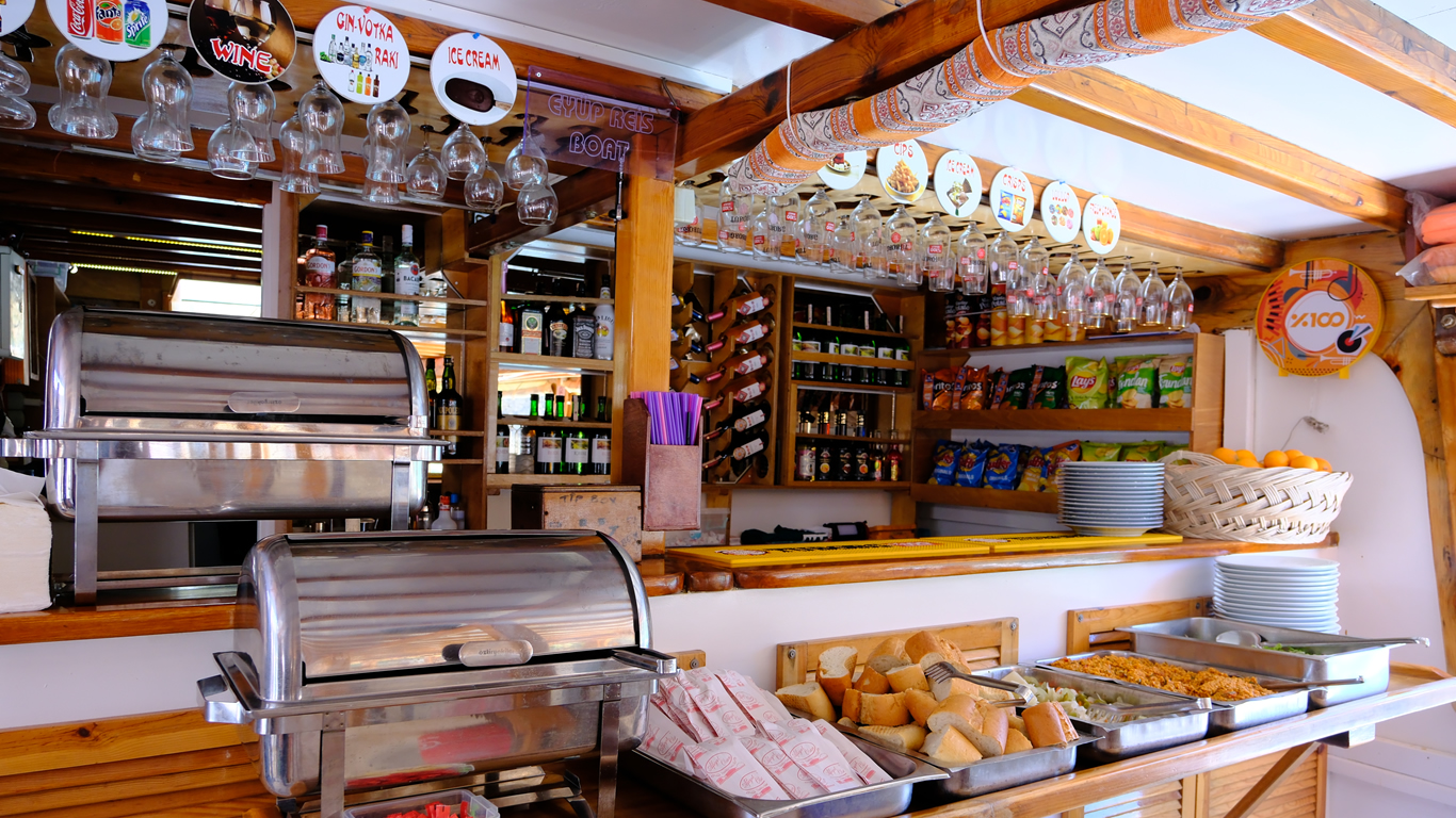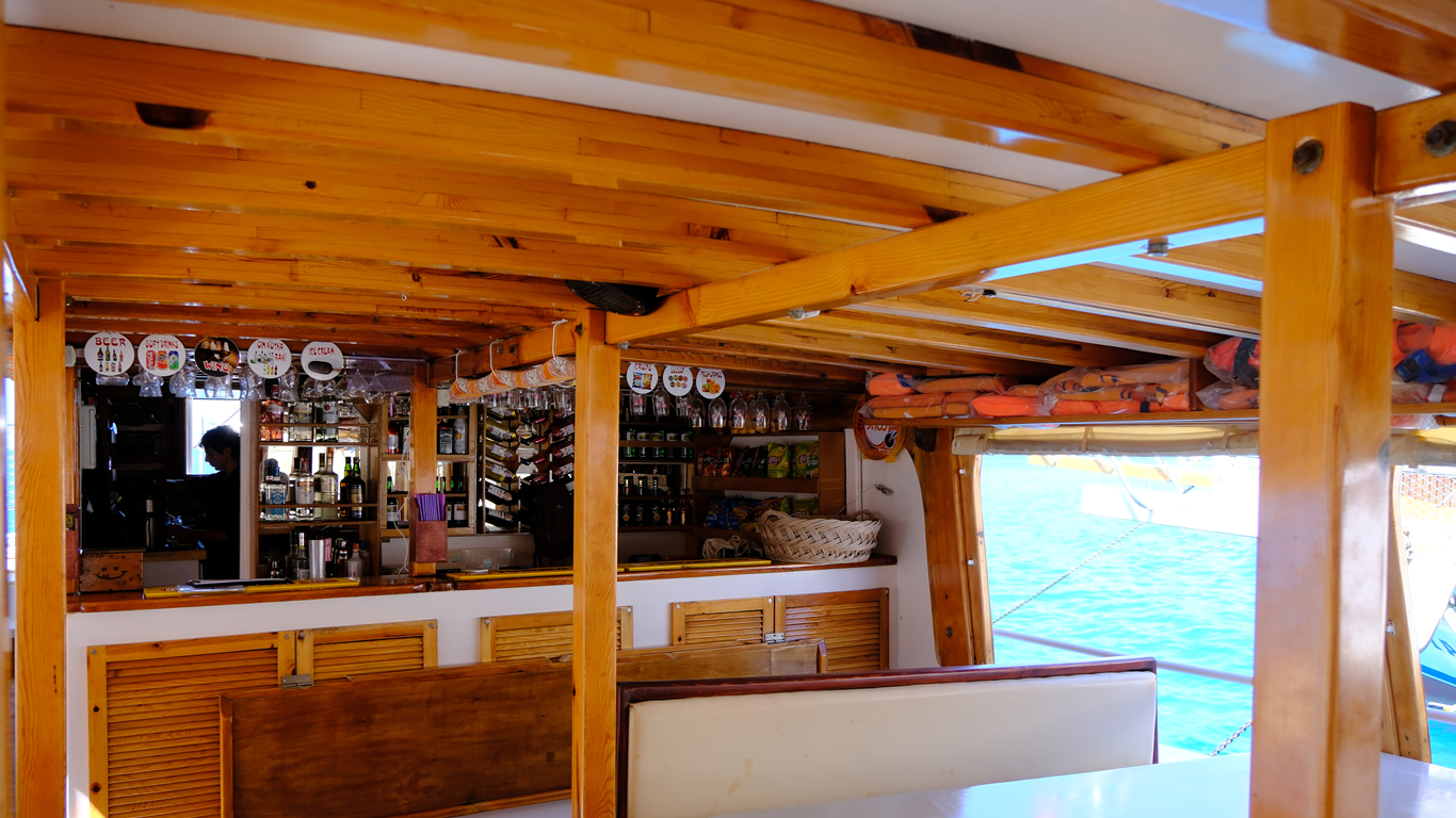 Tekne bar'ın dan şnorkel, gözlük, havluyu ücretli olarak temin edebilirsiniz.